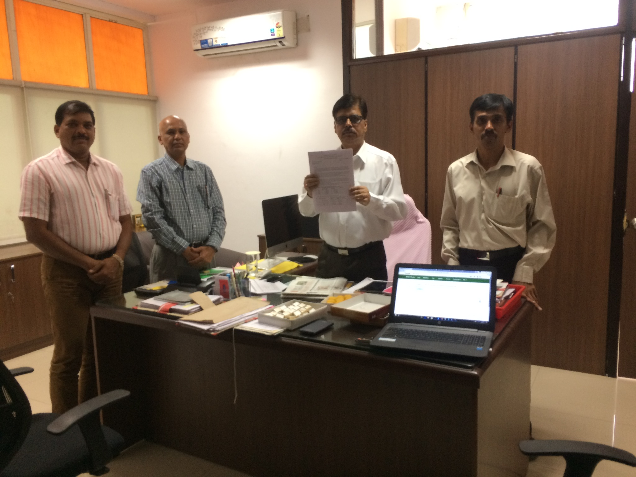 Director General, Sri Tushar A Tripathy IPS (center) issuing the first NOC thru Safe 24x7's NOC Portal. Present in the Picture from Left are ADFS Sri P Vankata Ramana, DFS Sri Jayaram Naik and CEO Srisaa Labs Sri Krishna Sri Satakarni