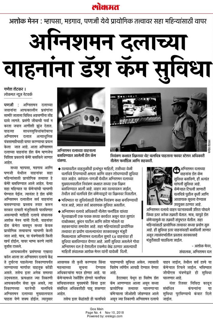 News article in Local News Paper in Goa describing the Fire Tender Dashboard Camera and its benefits for the Fire Department.